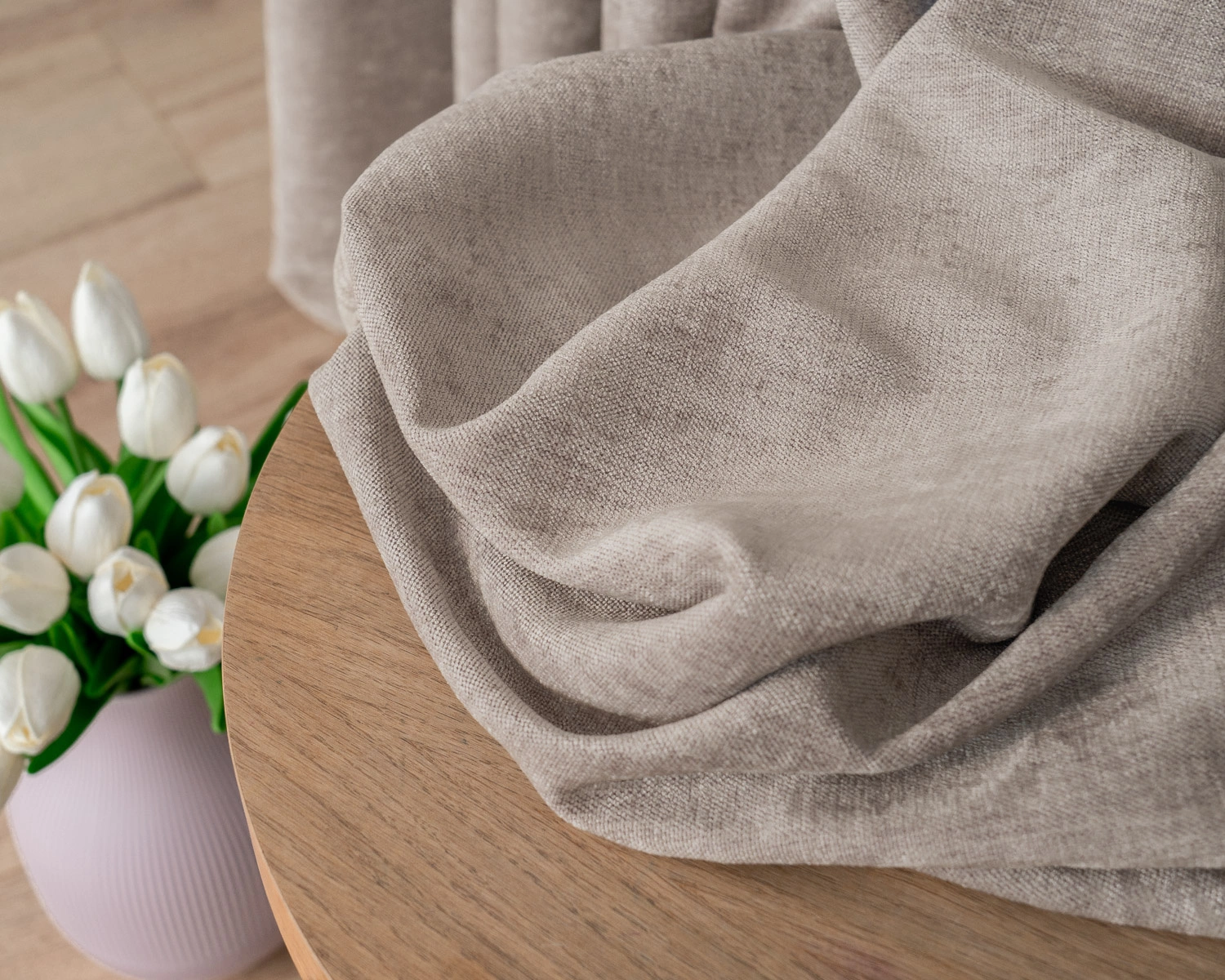 Jednokolorowa tkanina zasłonowa o strukturze weluru. Jest miękka i miła w dotyku, bardzo dobrze się układa. Idealna na zasłony, poduszki i inne dekoracje.