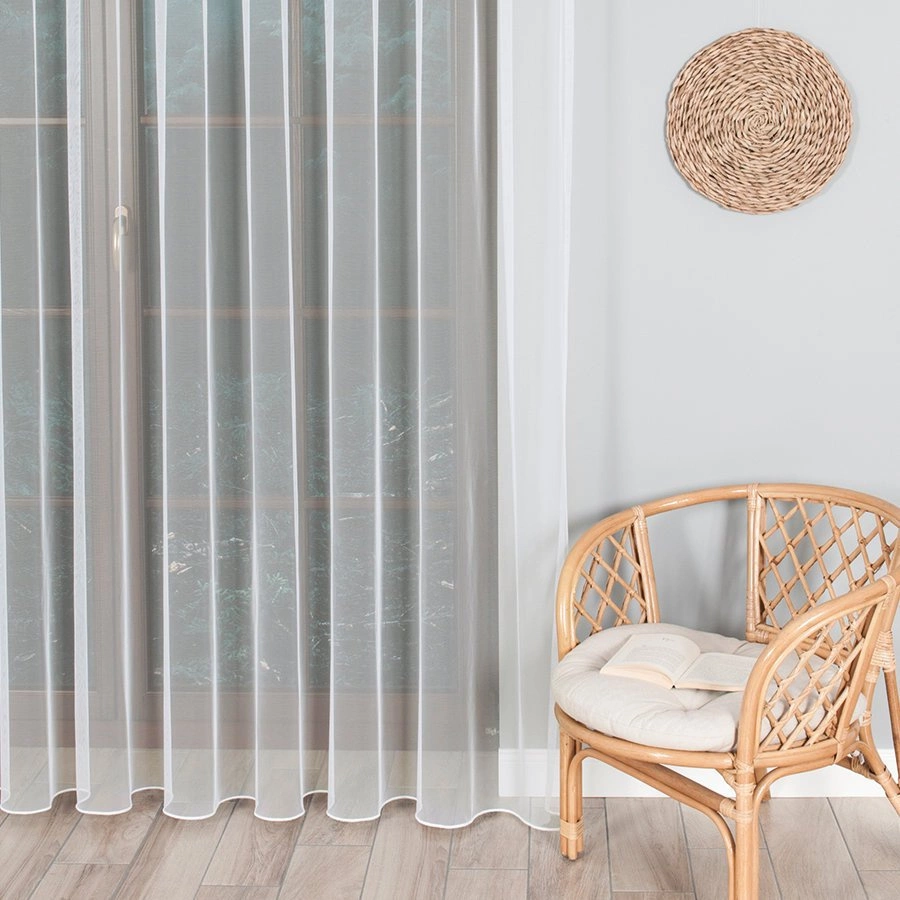 Firanka tiulowa TULGREK o strukturze siatki w kształcie plastra miodu. Jest lekka, zwiewna, bardzo ładnie się układa oraz przepuszcza dużo światła. Dolny brzeg jest wykończony fabrycznym obciążnikiem. Firanka prezentuję się najlepiej gdy jest namarszczona w stosunki 1:2 lub 1:2,5