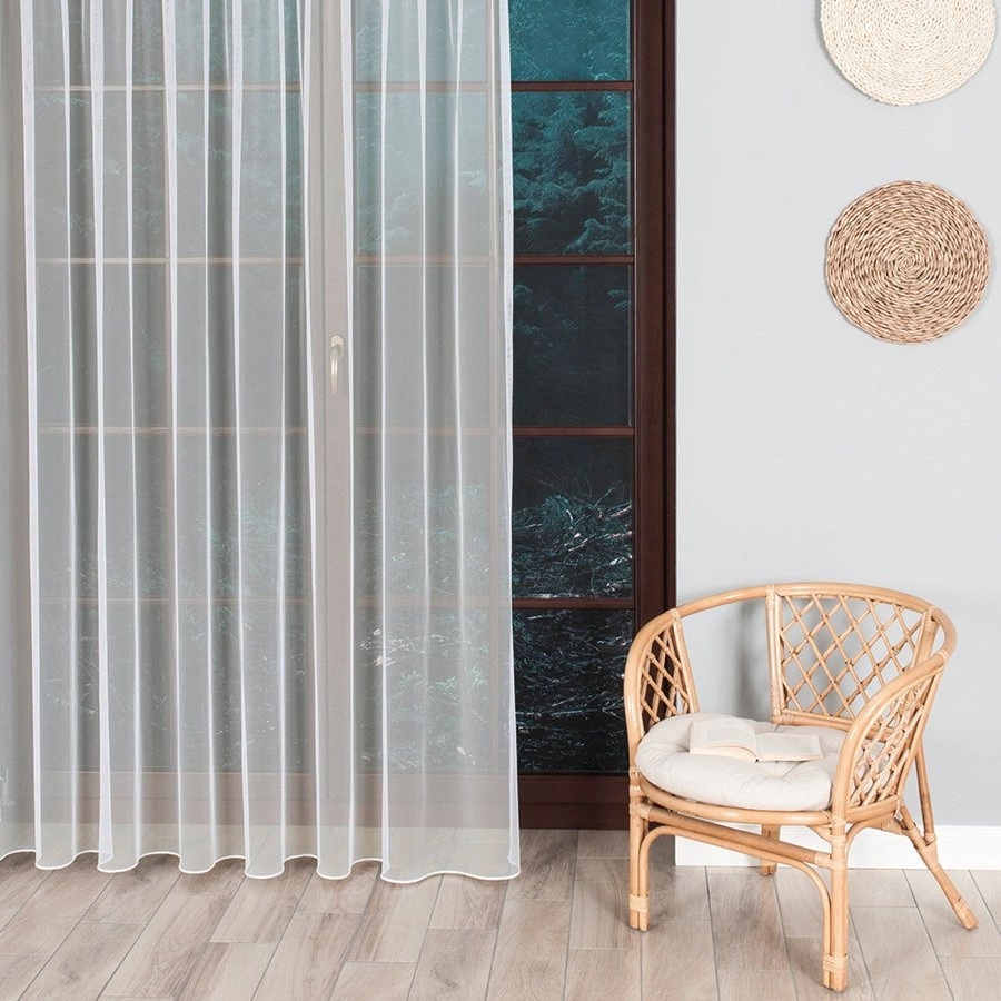 Firanka tiulowa TULGREK o strukturze siatki w kształcie plastra miodu. Jest lekka, zwiewna, bardzo ładnie się układa oraz przepuszcza dużo światła. Dolny brzeg jest wykończony fabrycznym obciążnikiem. Firanka prezentuję się najlepiej gdy jest namarszczona w stosunki 1:2 lub 1:2,5