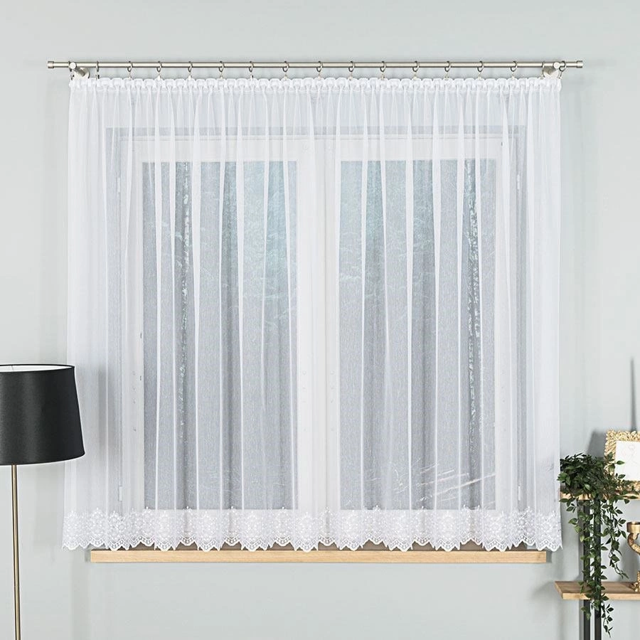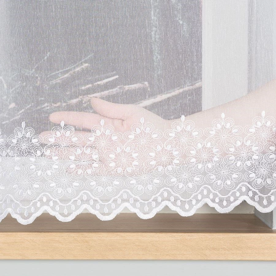 Firanka na metry z eleganckim haftowanym wzorem umieszczonym u dołu. Wzór, wykonany w delikatnej kolorystyce, subtelnie zdobi całą firankę, nadając jej wyjątkowego charakteru. Dzięki możliwości zakupu firanki na metry, można ją idealnie dopasować do wymiarów okna i stworzyć wyjątkową dekorację okienną w każdym pomieszczeniu.