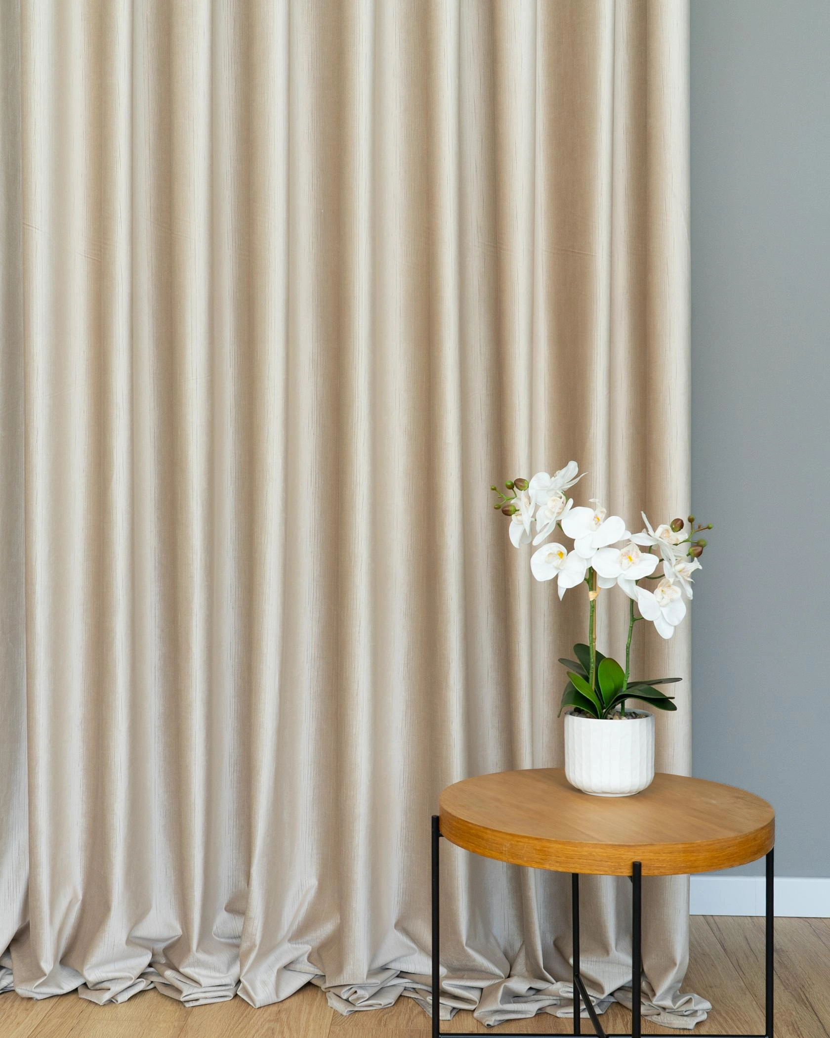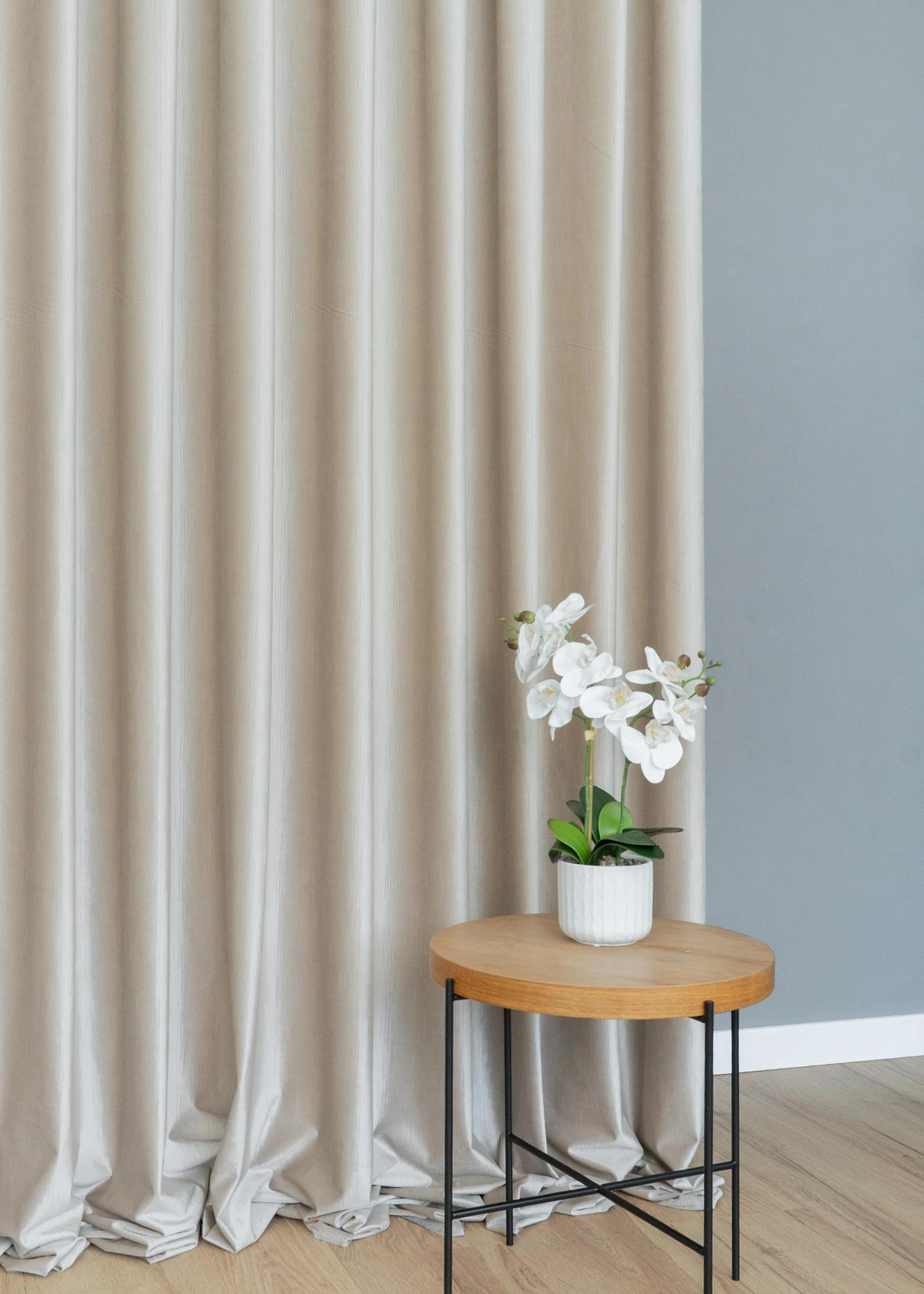 Przedstawiamy wyjątkową tkaninę zasłonową wykonaną z wysokiej jakości welwetu, która zachwyca subtelną, pionową strukturą przypominającą delikatne prążki. Jej powierzchnia pięknie odbija światło, tworząc eleganckie, miękkie załamania i nadając wnętrzu szlachetnego charakteru.