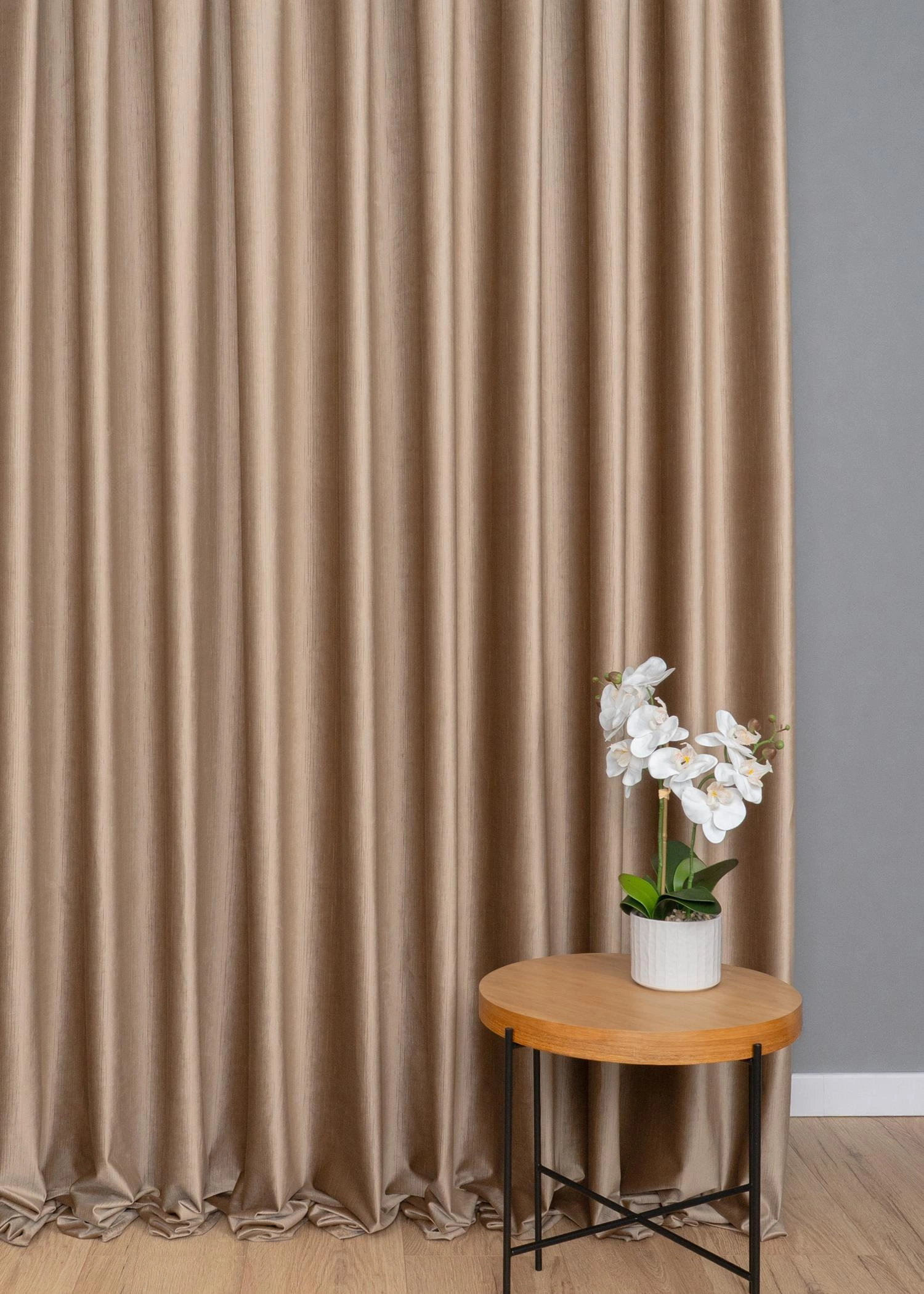 Przedstawiamy wyjątkową tkaninę zasłonową wykonaną z wysokiej jakości welwetu, która zachwyca subtelną, pionową strukturą przypominającą delikatne prążki. Jej powierzchnia pięknie odbija światło, tworząc eleganckie, miękkie załamania i nadając wnętrzu szlachetnego charakteru.
