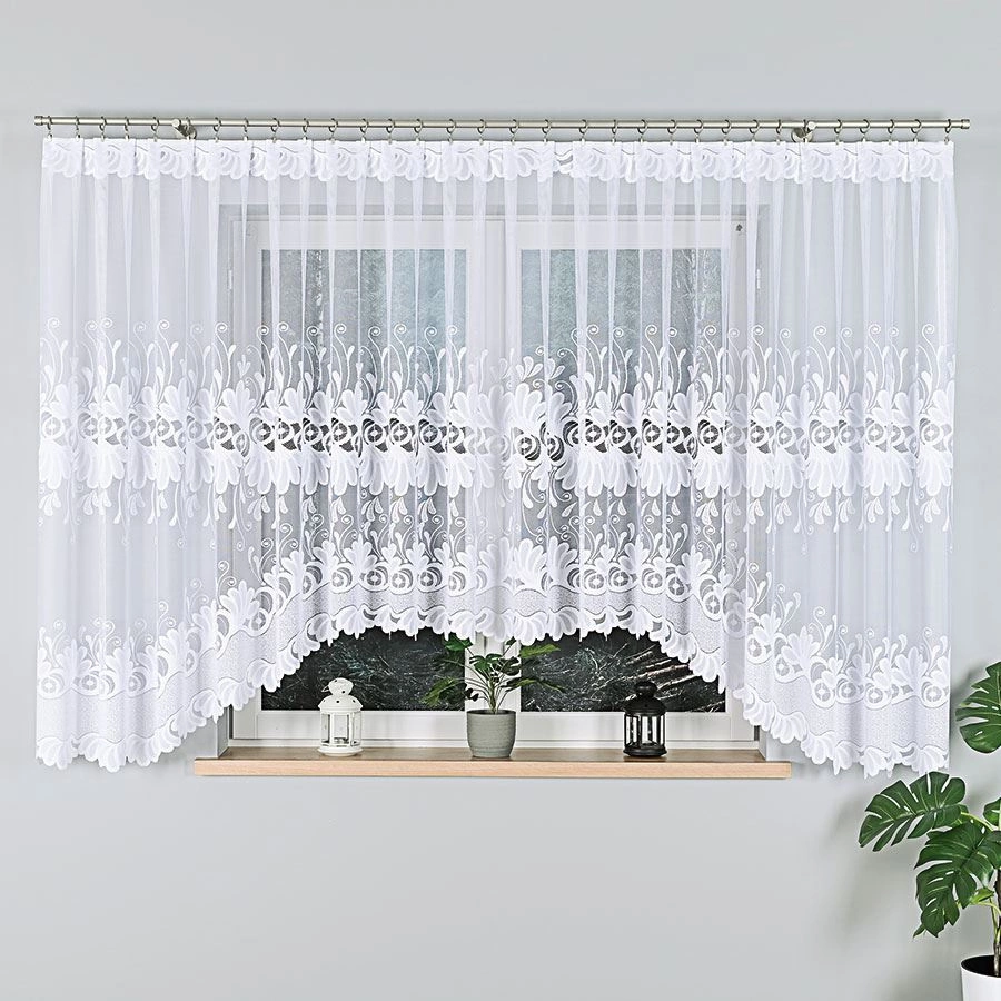• Jeśli poszukujesz ciekawego i ponadczasowego rozwiązania na dekorację dużego okna kuchennego, nasza biała firana o wymiarach 540x160 cm (przed zmarszczeniem) będzie dla Ciebie idealnym wyborem.